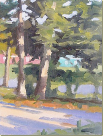 This one was painted in my friends’ driveway, looking through the hedge toward the street. I loved the strong light on the spruce trees, the purplish shadows, and the glimpse of houses and lawns through the hedge. I’m not sure someone unfamiliar with the spot would get all that from the painting. It’s hard not to try to include everything. But it’s so much fun to start with a blank canvas and end up with a little slice of nature and the memory of the sights, sounds, smells, and feel of a couple of hours spent painting.